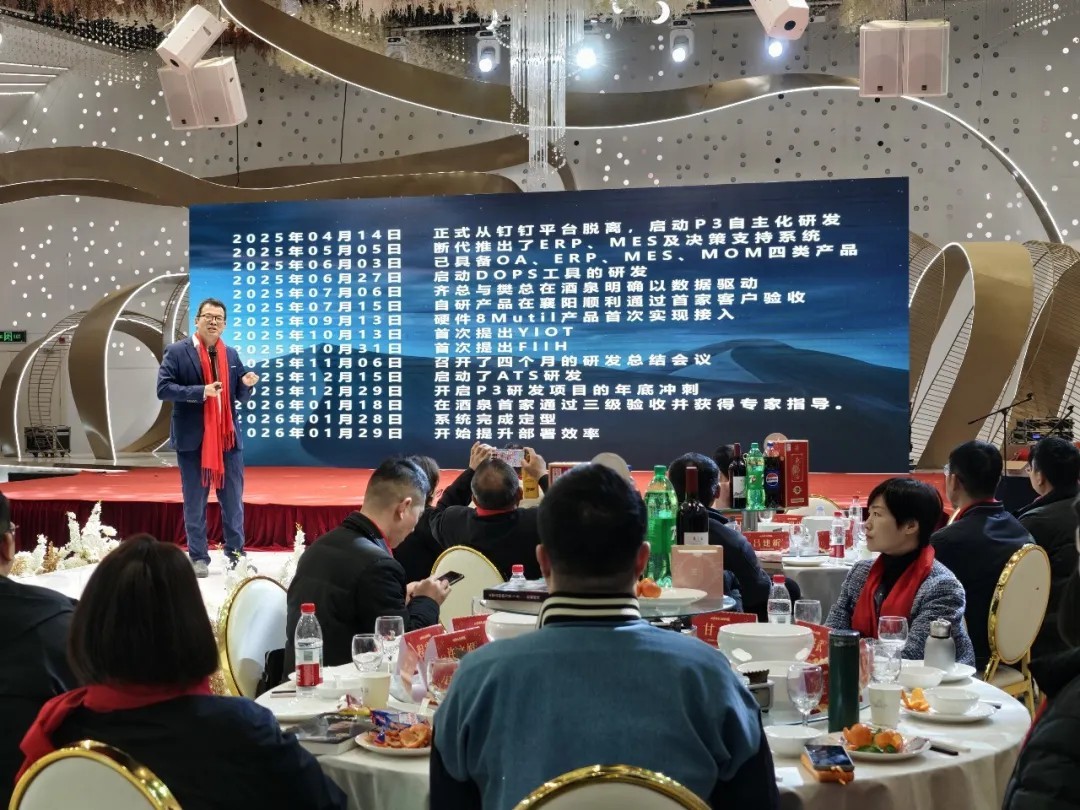 “我们虽然有收获,但也是冰火两重天的一年,我们研发费是预算的70倍,差旅费是6.8倍,我们储备现金剧降。在这AI已来,制造业企业必须全站数字化的时代,数字化行业产品迎来了一个发展的短暂窗口期。我有一个月就服务了19个城市,温差55℃,海拔差3000米,最东哈尔滨,最南深圳,最西最北玉门,行程20000余公里。我不知道对错,我不知道未来生死,只是想不辜负各地政府、广大企业、各位伙伴、各位同事的信任与支持,只是不敢辜负这么美妙而又稍纵即逝的数字化革新机遇的时代。亚为2025年所做的,据AI分析,我们大半年时间,用方便一秒钟文化和20年最纯粹最完美的技术积累,用最极致的技术创新,干了一件本应一个多亿、四年才能完成的巨大研发任务。无数的来来往往,无数的汗水与热泪,无数的艰难痛苦,都凝聚成了产品。亚为不仅研发,更是经历了大量交付和国家级验收,最近半年在全国18个城市部署了产品,其中有11个城市的项目大约通过了220余场次,600多人次的专家评审。在专家的指导下,实现了系统的秒级更新,创造了行业奇迹。亚为P4平台,在2026年会快速应用到数千家企业,用全站式数字化智能体,为无数企业的数字化、智能化、无人化制造服务!”
