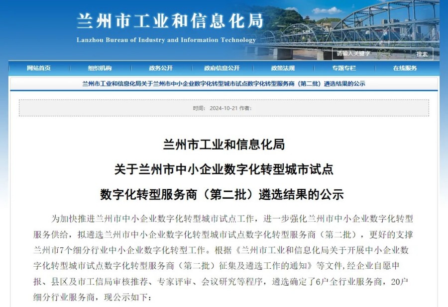 近日,兰州市工业和信息化局发布《关于兰州市中小企业数字化转型城市试点数字化转型服务商(第二批)遴选结果的公示 》,遴选确定了6户全行业服务商,20户细分行业服务商。武汉亚为电子科技有限公司(以下简称“亚为”)成功入选"兰州市中小企业数字化转型城市试点数字化转型服务商"(通用零部件制造),助力兰州市中小企业数字化转型升级。